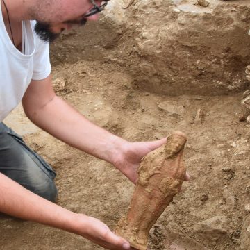 Swiss archaeologists and their Greek colleagues have been excavating the sanctuary of the goddess Artemis Amarysia in Amarynthos, an ancient town in the territory of Eretria on the island of Euboea, for the past fifteen years. The excavations are under the co-direction of Professor Sylvian Fachard (ESAG – University of Lausanne) and the Ephor of Antiquities of Euboea, Dr. Angeliki Simosi. The exact location of the Artemision, one of the most important places of worship of the Euboeans, has eluded archaeologists for over a century. Archaeologists have uncovered a temple that was in use and rebuilt for several centuries. The first temple, built around 650 BC, was destroyed at the end of the 6th century. A second, more monumental temple was rebuilt shortly after, around 500 BC. Rich offerings were deposited on this occasion; the excavations brought to light over 600 objects, including ceramic and bronze vessels, painted terracotta figurines, gold jewelry, silver, faience, glass and semi-precious stones, orientalizing seals in the shape of scarabs, as well as weapons (including a helmet and a shield).