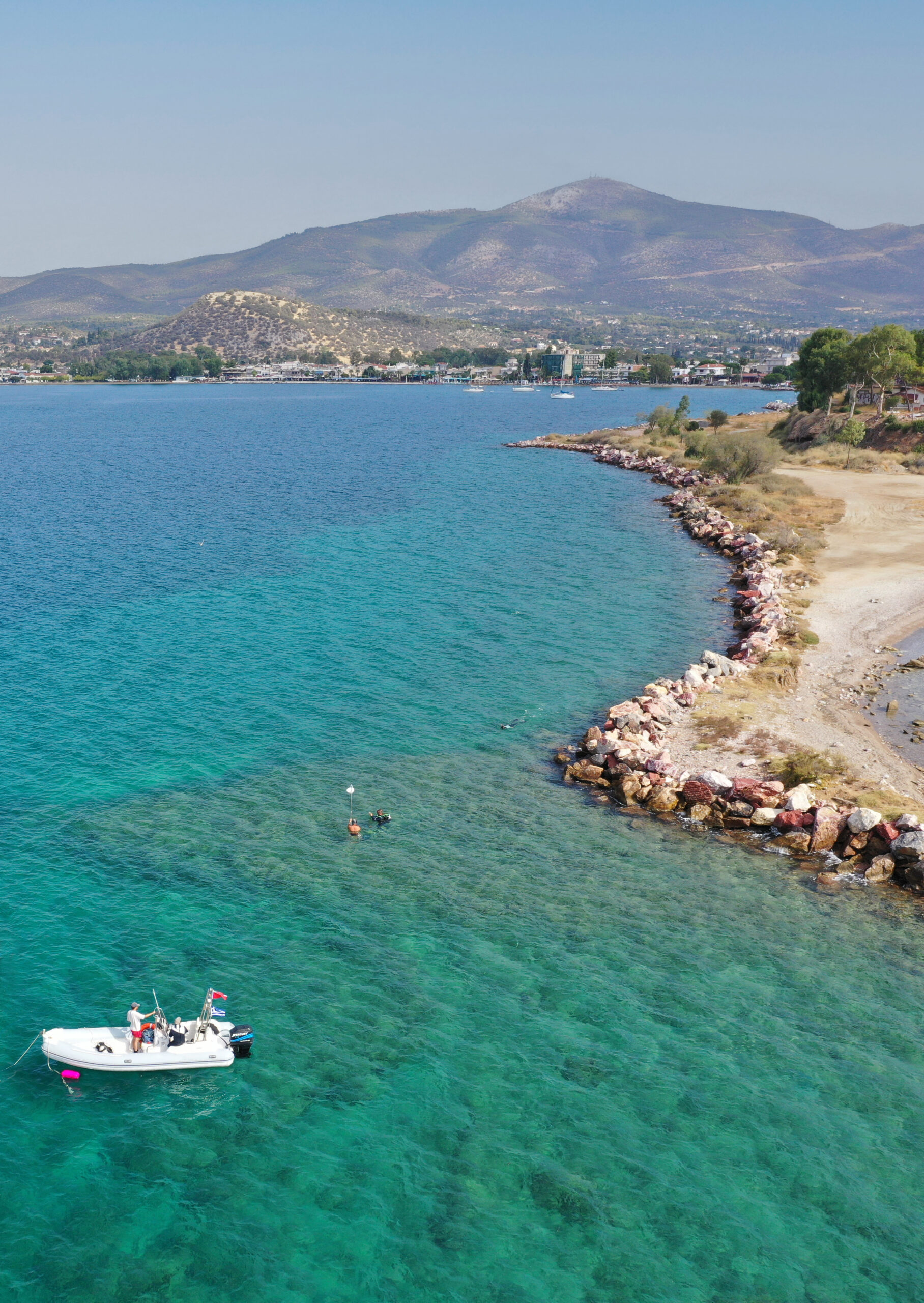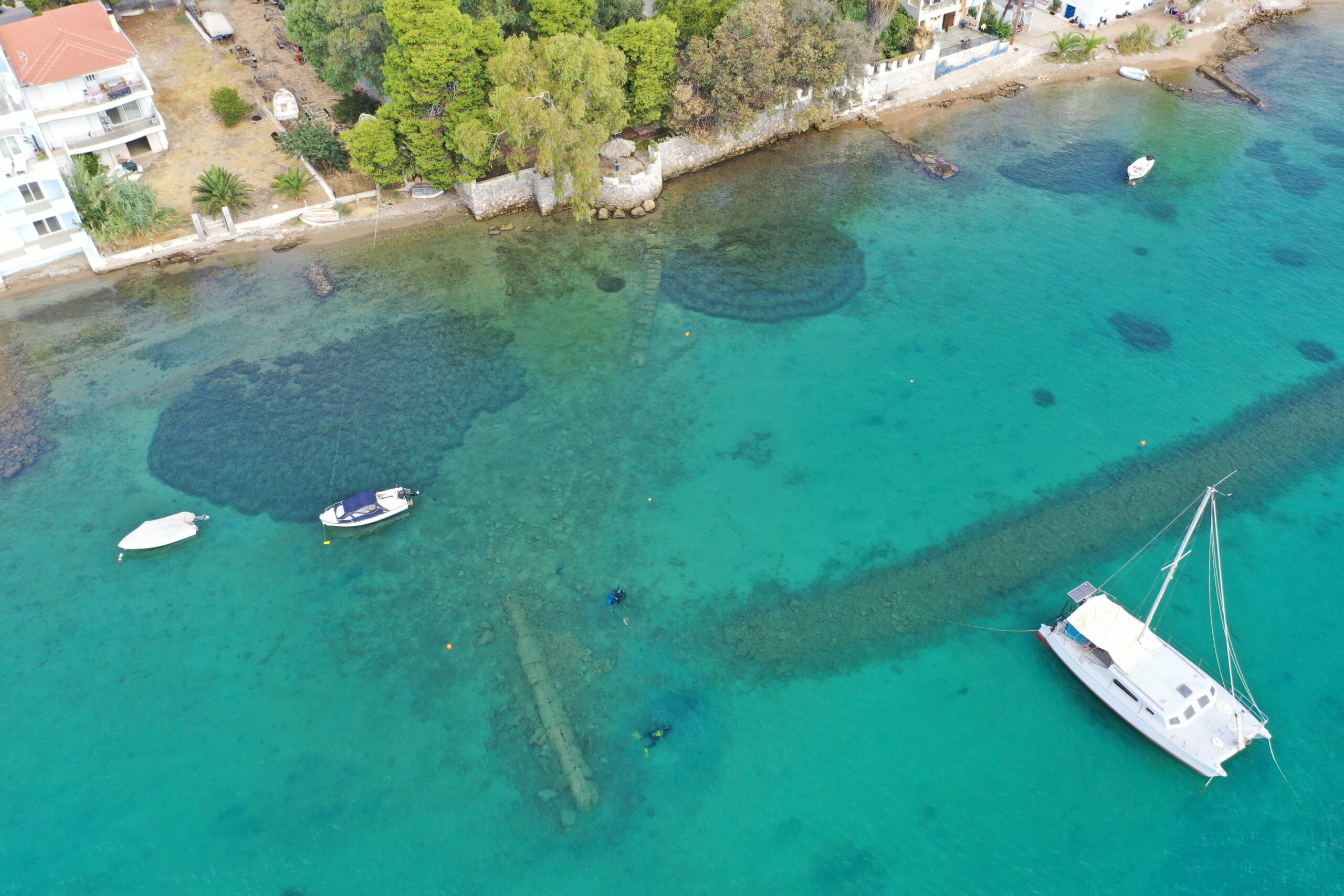 L’exploration des structures sous-marines du port d’Érétrie a débuté cette année avec une deuxième campagne de nettoyage et de relevés, qui avait pour objectif de documenter la jetée ouest et de localiser son pendant oriental. Parallèlement, le relevé bathymétrique du grand bassin portuaire a été achevé et une petit darse portuaire occidentale a fait l’objet d’une étude approfondie.