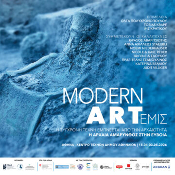 These works, offering a fresh look at Antiquity and archaeological research, will be exhibited from 18 April 2026 at the Athens Municipal Arts Center (Kentro Technon). The opening will take place on Tuesday, 21 April at 19:00, and the exhibition will run until 3 May 2026. It will then move in May to the Municipal Gallery (Dimotiki Pinakothiki) of Chalkis in Euboea—the island where everything began.